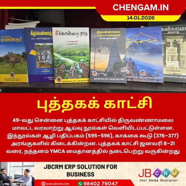 49-வது சென்னை புத்தகக் காட்சியில் திருவண்ணாமலை மாவட்ட வரலாற்று ஆய்வு நூல்கள் வெளியிடப்பட்டுள்ளன. இந்நூல்கள் ஆழி பதிப்பகம் (595-596), காக்கை கூடு (376-377) அரங்குகளில் கிடைக்கின்றன. புத்தகக் காட்சி ஜனவரி 8-21 வரை, நந்தனம் YMCA மைதானத்தில் நடைபெற்று வருகின்றது.