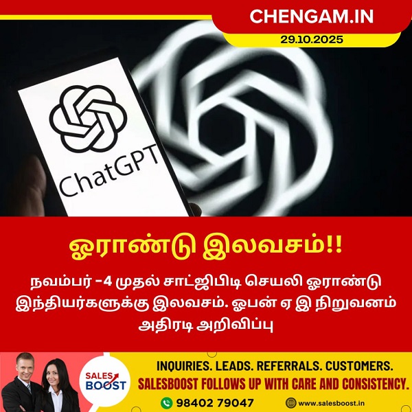 நவம்பர் – 4 முதல் சாட்ஜிபிடி செயலி ஓராண்டு இந்தியர்களுக்கு இலவசம். ஓபன் ஏ இ நிறுவனம் அதிரடி அறிவிப்பு.