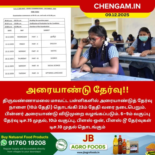 திருவண்ணாமலை மாவட்ட பள்ளிகளில் அரையாண்டுத் தேர்வு நாளை (10ம் தேதி) தொடங்கி 23ம் தேதி வரை நடைபெறும். பின்னர் அரையாண்டு விடுமுறை வழங்கப்படும். 6-9ம் வகுப்பு தேர்வு டிச.15 முதல், 10ம் வகுப்பு, பிளஸ் ஒன், பிளஸ் டூ தேர்வுகள் டிச.10 முதல் தொடங்கும்