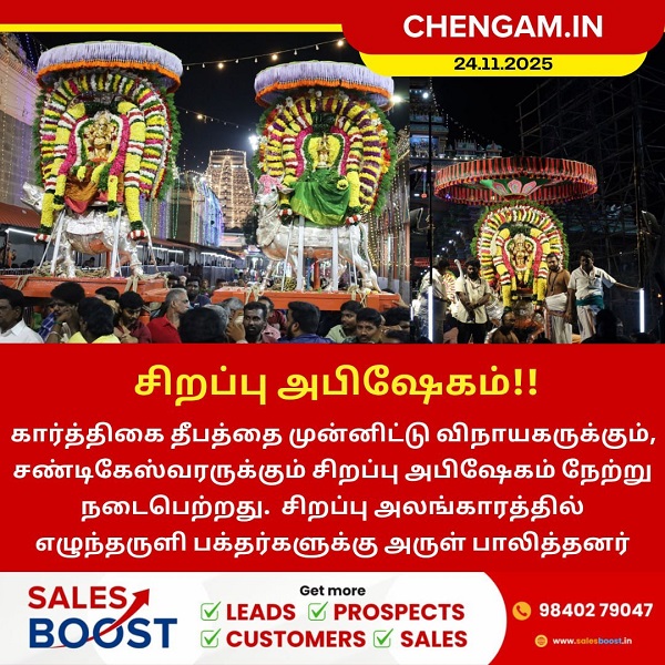 கார்த்திகை தீபத்தை முன்னிட்டு, விநாயகருக்கும் சண்டிகேஸ்வரருக்கும் நேற்று சிறப்பு அபிஷேகம் நடைபெற்றது. பின்னர், இருவரும் சிறப்பு அலங்காரத்தில் எழுந்தருளி பக்தர்களுக்கு அருள் பாலித்தனர்.