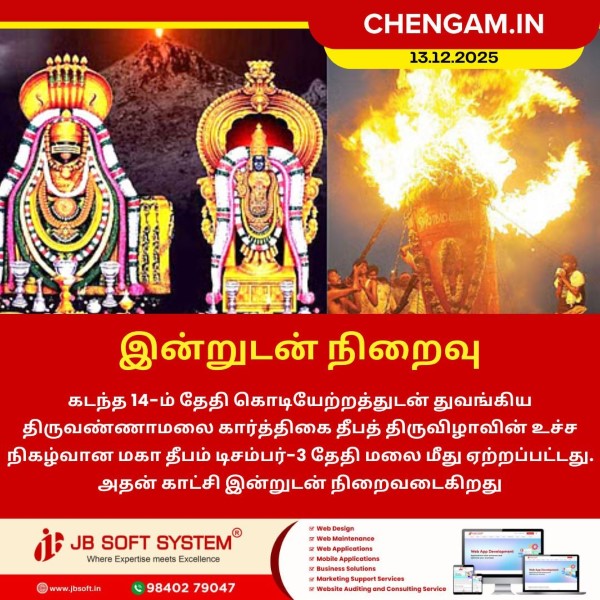 கடந்த 14-ம் தேதி கொடியேற்றத்துடன் துவங்கிய திருவண்ணாமலை கார்த்திகை தீபத் திருவிழாவின் உச்ச நிகழ்வான மகா தீபம் டிசம்பர்-3 தேதி மலை மீது ஏற்றப்பட்டது. அதன் காட்சி இன்றுடன் நிறைவடைகிறது.