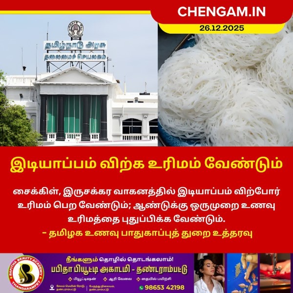 சைக்கிள், இருசக்கர வாகனத்தில் இடியாப்பம் விற்போர் உரிமம் பெற வேண்டும்; ஆண்டுக்கு ஒருமுறை உணவு உரிமத்தை புதுப்பிக்க வேண்டும் – தமிழக உணவு பாதுகாப்புத் துறை உத்தரவு