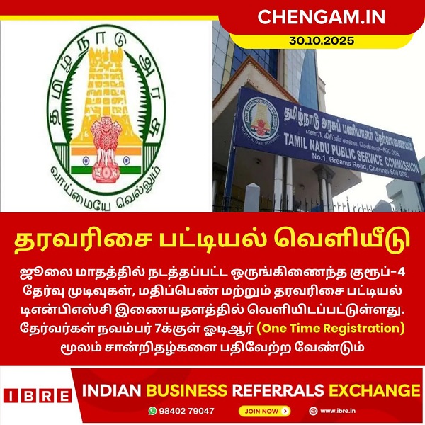 ஜூலை மாதத்தில் நடத்தப்பட்ட ஒருங்கிணைந்த குரூப்-4 தேர்வு முடிவுகள், மதிப்பெண் மற்றும் தரவரிசை பட்டியல் டிஎன்பிஎஸ்சி இணையதளத்தில் வெளியிடப்பட்டுள்ளது. தேர்வர்கள் நவம்பர் 7க்குள் ஓடிஆர் (One Time Registration) மூலம் சான்றிதழ்களை பதிவேற்ற வேண்டும்.