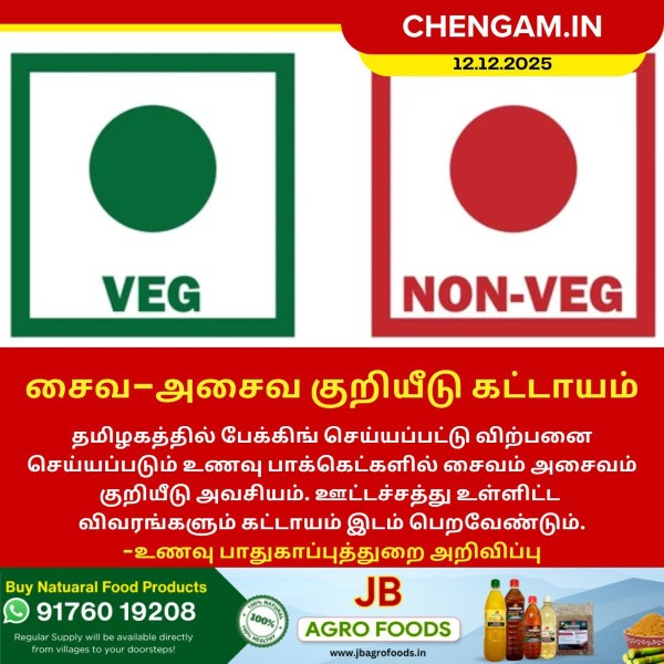 தமிழகத்தில் பேக்கிங் செய்யப்பட்டு விற்பனை செய்யப்படும் உணவு பாக்கெட்களில் சைவம் அசைவம் குறியீடு அவசியம். ஊட்டச்சத்து உள்ளிட்ட விவரங்களும் கட்டாயம் இடம் பெறவேண்டும் – உணவு பாதுகாப்புத்துறை அறிவிப்பு.